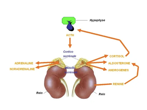 L’hypophyse produit l’hormone ACTH (corticotrope). Cette hormone corticotrope agit sur les glandes corticosurrénales. Le rôle de ces glandes est la production de la fameuse hormone cortisol.
